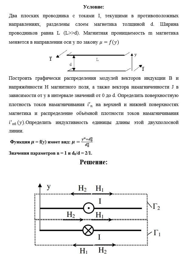 Условие:Два плоских проводника с токами I, текущими в противоположных направлениях, разделены слоем магнетика толщиной d. Ширина проводников равна L (L>>d). Магнитная проницаемость m магнетика меняется в направлении оси у по закону