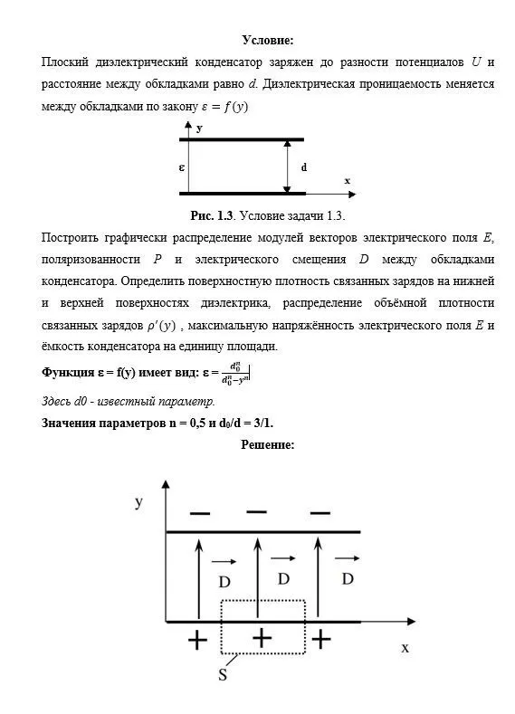 Построить графически распределение модулей векторов электрического поля Е, поляризованности Р и электрического смещения D между обкладками конденсатора. Определить поверхностную плотность связанных зарядов на нижней и верхней поверхностях диэлектрика, распределение объёмной плотности связанных зарядов , максимальную напряжённость электрического поля Е и ёмкость конденсатора на единицу площади.