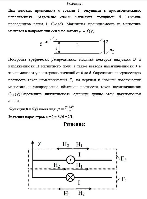 Два плоских проводника с токами I, текущими в противоположных направлениях, разделены слоем магнетика толщиной d. Ширина проводников равна L (L>>d). Магнитная проницаемость m магнетика меняется в направлении оси у по закону