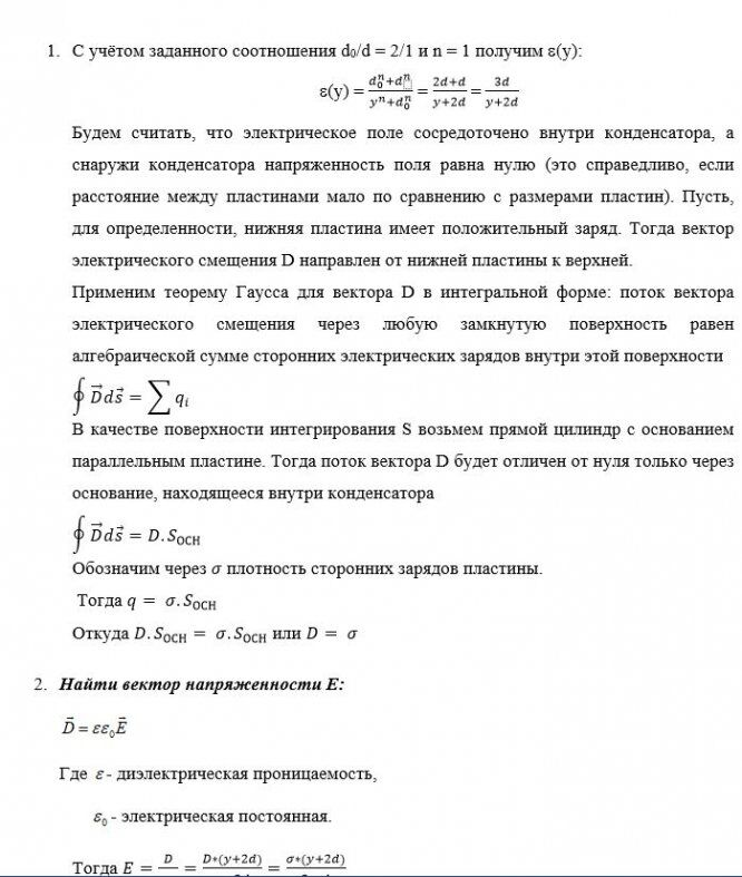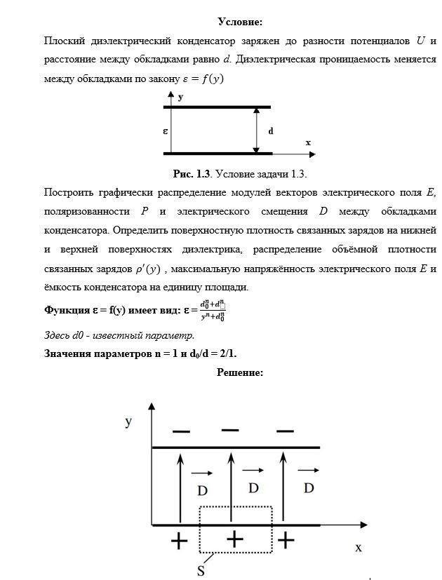 Построить графически распределение модулей векторов электрического поля Е, поляризованности Р и электрического смещения D между обкладками конденсатора. Определить поверхностную плотность связанных зарядов на нижней и верхней поверхностях диэлектрика, распределение объёмной плотности связанных зарядов , максимальную напряжённость электрического поля Е и ёмкость конденсатора на единицу площади.
