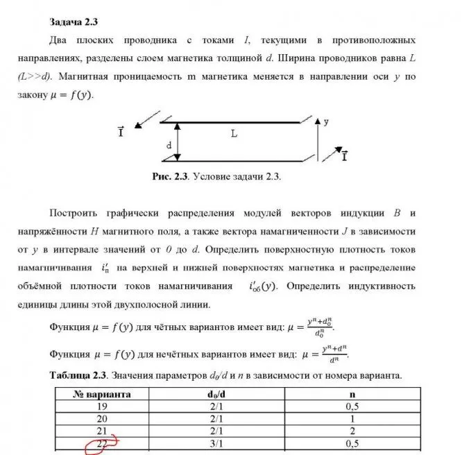 Построить графически распределения модулей векторов индукции B и напряжённости H магнитного поля, а также вектора намагниченности J в зависимости от у в интервале значений от 0 до d. Определить поверхностную плотность токов намагничивания на верхней и нижней поверхностях магнетика и распределение объёмной плотности токов намагничивания .Определить индуктивность единицы длины этой двухполосной линии.