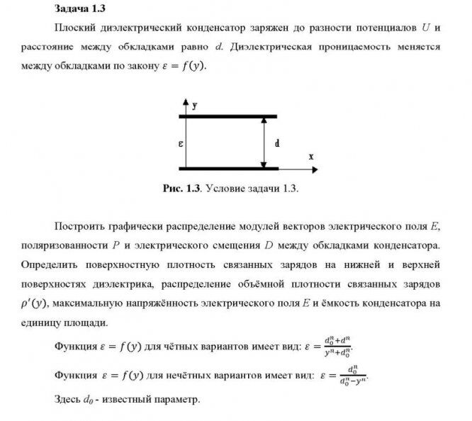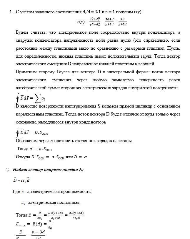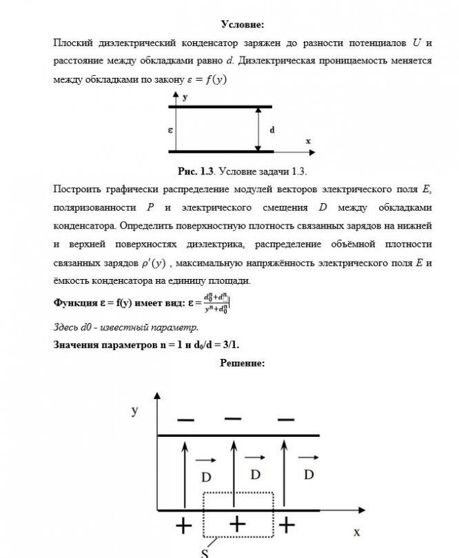 Построить графически распределение модулей векторов электрического поля Е, поляризованности Р и электрического смещения D между обкладками конденсатора. Определить поверхностную плотность связанных зарядов на нижней и верхней поверхностях диэлектрика, распределение объёмной плотности связанных зарядов , максимальную напряжённость электрического поля Е и ёмкость конденсатора на единицу площади.