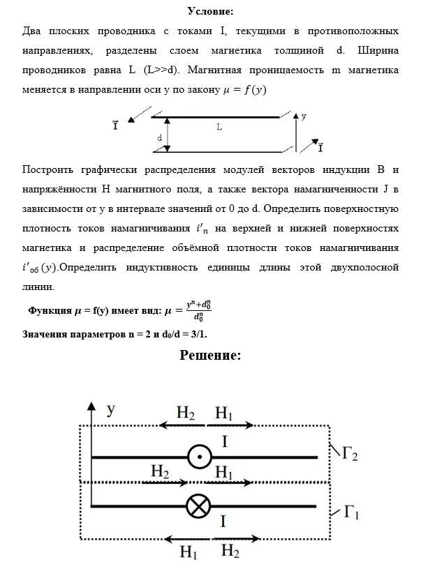 Два плоских проводника с токами I, текущими в противоположных направлениях, разделены слоем магнетика толщиной d. Ширина проводников равна L (L>>d). Магнитная проницаемость m магнетика меняется в направлении оси у по закону