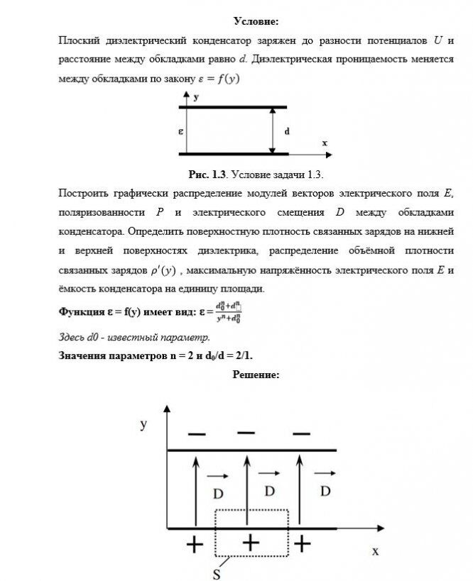 Построить графически распределение модулей векторов электрического поля Е, поляризованности Р и электрического смещения D между обкладками конденсатора. Определить поверхностную плотность связанных зарядов на нижней и верхней поверхностях диэлектрика, распределение объёмной плотности связанных зарядов , максимальную напряжённость электрического поля Е и ёмкость конденсатора на единицу площади.