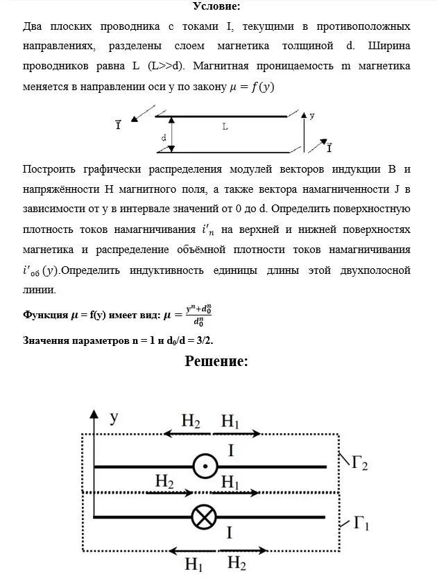 Построить графически распределения модулей векторов индукции B и напряжённости H магнитного поля, а также вектора намагниченности J в зависимости от у в интервале значений от 0 до d. Определить поверхностную плотность токов намагничивания на верхней и нижней поверхностях магнетика и распределение объёмной плотности токов намагничивания .Определить индуктивность единицы длины этой двухполосной линии.