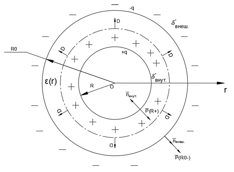 Сферический диэлектрический конденсатор имеет радиусы внешней и внутренней обкладок R0 и R соответственно. Заряд конденсатора равен q. Диэлектрическая проницаемость меняется между обкладками по закону ԑ=f(r).