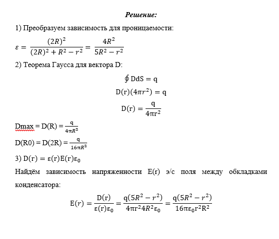 Построить графически распределение модулей векторов электрического поля Е, поляризованности Р и электрического смещения D между обкладками конденсатора. Определить поверхностную плотность связанных зарядов на внутренней σ1’ и внешней σ2’ поверхностях диэлектрика, распределение объёмной плотности связанных зарядов ρ’(r), максимальную напряженность электрического поля Е и ёмкость конденсатора.