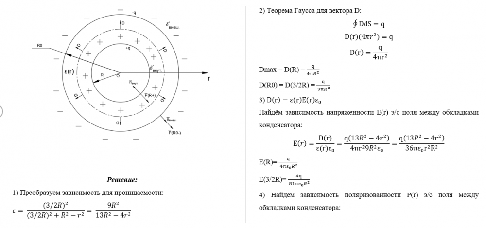 Построить графически распределение модулей векторов электрического поля Е, поляризованности Р и электрического смещения D между обкладками конденсатора. Определить поверхностную плотность связанных зарядов на внутренней σ1’ и внешней σ2’ поверхностях диэлектрика, распределение объёмной плотности связанных зарядов ρ’(r), максимальную напряженность электрического поля Е и ёмкость конденсатора.