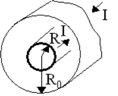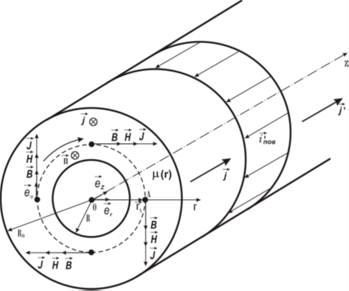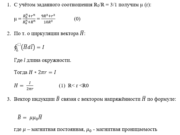 R соответственно, протекает ток I. Пространство между проводниками заполнено магнетиком, магнитная проницаемость которого меняется по закону μ = f(r).