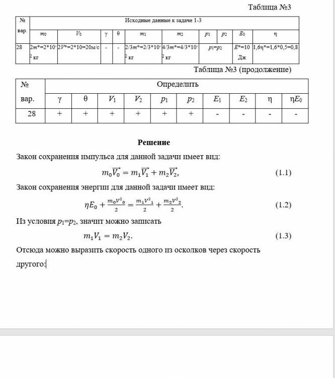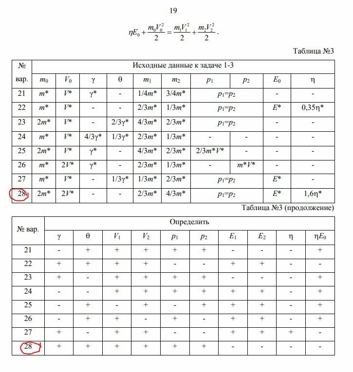 Общие исходные данные: m*=10-2 кг, V*=10 м/с, γ*=π/2, E*=10 Дж, η*=0,5. Другие исходные данные и искомые величины для каждого варианта задания представлены в таблице №3.