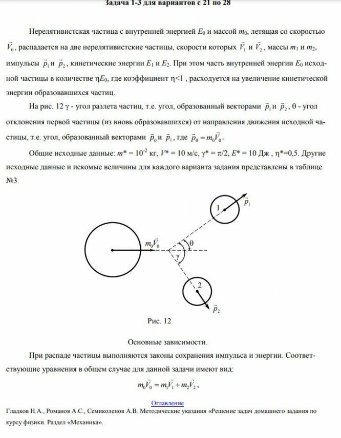 Нерелятивистская частица с внутренней энергией E0 и массой m0, летящая со скоростью , распадается на две нерелятивистские частицы, скорости которых и , массы m1 и m2, импульсы и , кинетические энергии E1 и E2. При этом часть внутренней энергии E0 исходной частицы в количестве ηE0, где коэффициент η<1, расходуется на увеличение кинетической энергии образовавшихся частиц.