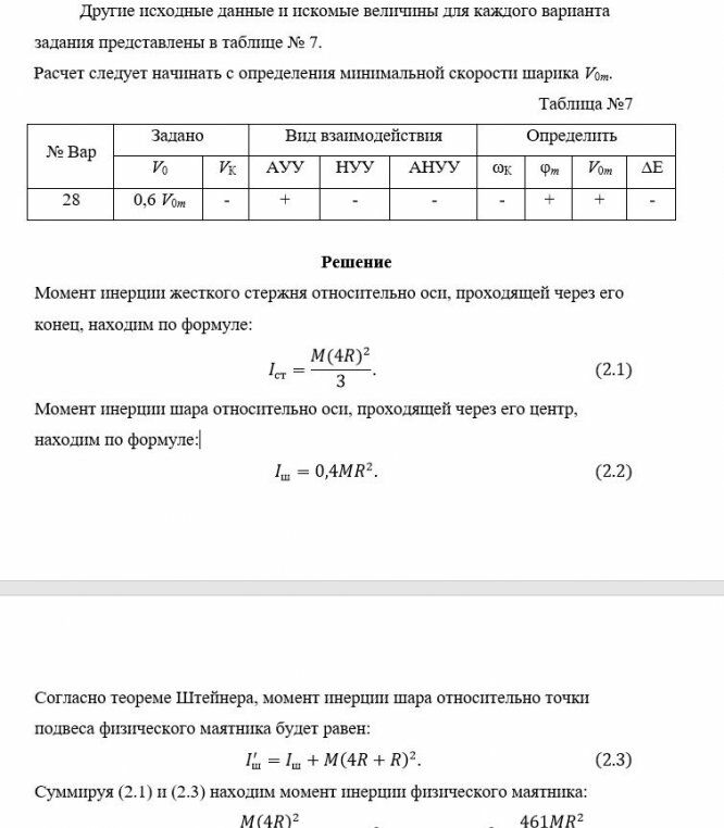 V0m – минимальная скорость шарика, при которой маятник после удара, приобретая угловую скорость ω0m, совершает полный оборот;