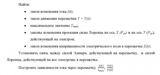 По двум гладким медным шинам скользит невесомая перемычка, к которой приложена переменная сила F(t). Сопротивление перемычки равно R0, поперечное сечение S, концентрация носителей заряда (электронов) в проводнике перемычки равна n0. Перемычка замыкает электрическую цепь, состоящую либо из конденсатора ёмкости С, либо из индуктивности L или из сопротивления R, в соответствии с рисунком. Расстояние между шинами l. Система находится в однородном переменном магнитном поле с индукцией В(t), перпендикулярном плоскости, в которой перемещается перемычка. Сопротивление шин, скользящих контактов, а также самоиндукция контура пренебрежимо малы. Ускорение перемычки в начальный момент времени конечно, а положение ее определено и равно Y(0) =Y0.