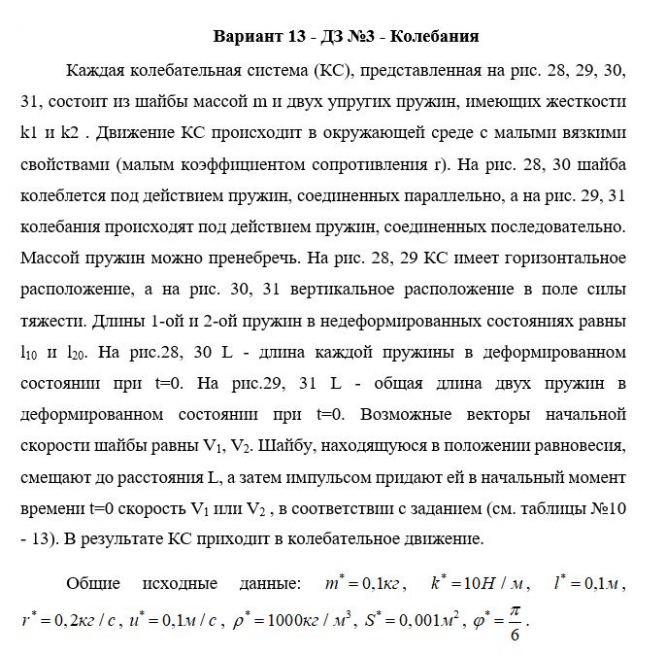 Вариант 13 - ДЗ №3 - КолебанияКаждая колебательная система (КС), представленная на рис. 28, 29, 30, 31, состоит из шайбы массой m и двух упругих пружин, имеющих жесткости k1 и k2 . Движение КС происходит в окружающей среде с малыми вязкими свойствами (малым коэффициентом сопротивления r). На рис. 28, 30 шайба колеблется под действием пружин, соединенных параллельно, а на рис. 29, 31 колебания происходят под действием пружин, соединенных последовательно. Массой пружин можно пренебречь. На рис. 28, 29 КС имеет горизонтальное расположение, а на рис. 30, 31 вертикальное расположение в поле силы тяжести. Длины 1-ой и 2-ой пружин в недеформированных состояниях равны l10 и l20. На рис.28, 30 L - длина каждой пружины в деформированном состоянии при t=0. На рис.29, 31 L - общая длина двух пружин в деформированном состоянии при t=0. Возможные векторы начальной скорости шайбы равны V1, V2. Шайбу, находящуюся в положении равновесия, смещают до расстояния L, а затем импульсом придают ей в начальный момент времени t=0 скорость V1 или V2, в соответствии с заданием (см. таблицы №10 - 13). В результате КС приходит в колебательное движение.