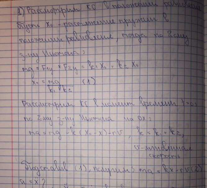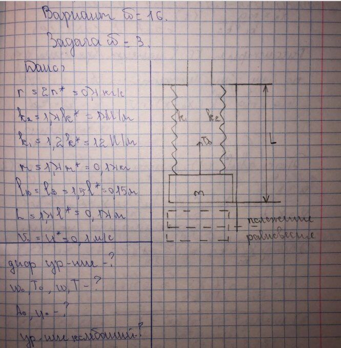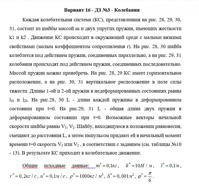 Каждая колебательная система (КС), представленная на рис. 28, 29, 30, 31, состоит из шайбы массой m и двух упругих пружин, имеющих жесткости k1 и k2 . Движение КС происходит в окружающей среде с малыми вязкими свойствами (малым коэффициентом сопротивления r). На рис. 28, 30 шайба колеблется под действием пружин, соединенных параллельно, а на рис. 29, 31 колебания происходят под действием пружин, соединенных последовательно. Массой пружин можно пренебречь. На рис. 28, 29 КС имеет горизонтальное расположение, а на рис. 30, 31 вертикальное расположение в поле силы тяжести. Длины 1-ой и 2-ой пружин в недеформированных состояниях равны l10 и l20. На рис.28, 30 L - длина каждой пружины в деформированном состоянии при t=0. На рис.29, 31 L - общая длина двух пружин в деформированном состоянии при t=0. Возможные векторы начальной скорости шайбы равны V1, V2. Шайбу, находящуюся в положении равновесия, смещают до расстояния L, а затем импульсом придают ей в начальный момент времени t=0 скорость V1 или V2, в соответствии с заданием (см. таблицы №10 - 13). В результате КС приходит в колебательное движение.Вар | r | k1 | k2 | m | l10 | l20 | L | V1 | V2 |