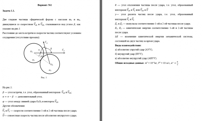 Две гладкие частицы сферической формы с массами m1 и m2, движущиеся со скоростями и , сталкиваются под углом , как указано на рис.1