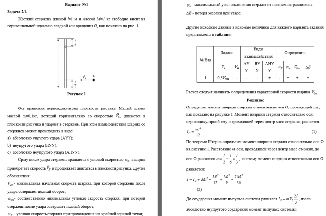 Малый шарик массой m=0,1кг, летящий горизонтально со скоростью  , движется в плоскости рисунка и ударяет в стержень. При этом взаимодействие шарика со стержнем может происходить в виде:  абсолютно упругого удара (АУУ); неупругого удара (НУУ);  абсолютно неупругого удара (АНУУ). Сразу после удара стержень вращается с угловой скоростью  , а шарик приобретает скорость   и продолжает двигаться в плоскости рисунка. Другие обозначения:   - минимальная начальная скорость шарика, при которой стержень после удара совершает полный оборот;   - соответственно минимальная угловая скорость стержня, при которой стержень после удара совершает полный оборот;   - угловая скорость стержня при прохождении им крайней верхней точки;  - максимальный угол отклонения стержня от положения равновесия.  DE - потеря энергии при ударе;    Другие исходные данные и искомые величины для каждого варианта задания представлены в таблице:.