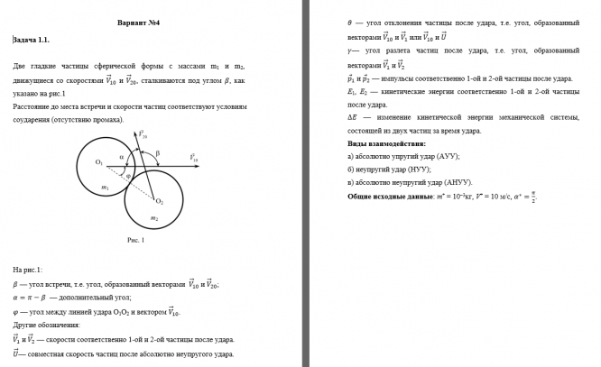 Две гладкие частицы сферической формы с массами m1 и m2, движущиеся со скоростями и , сталкиваются под углом , как указано на рис.1