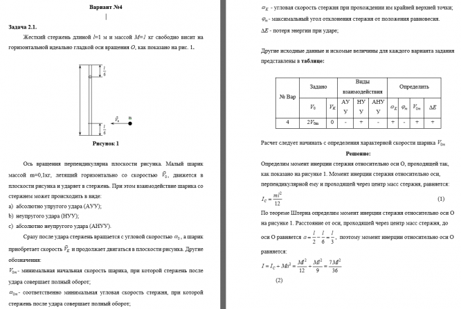 Малый шарик массой m=0,1кг, летящий горизонтально со скоростью , движется в плоскости рисунка и ударяет в стержень. При этом взаимодействие шарика со стержнем может происходить в виде: абсолютно упругого удара (АУУ); неупругого удара (НУУ); абсолютно неупругого удара (АНУУ). Сразу после удара стержень вращается с угловой скоростью , а шарик приобретает скорость и продолжает двигаться в плоскости рисунка. Другие обозначения: - минимальная начальная скорость шарика, при которой стержень после удара совершает полный оборот; - соответственно минимальная угловая скорость стержня, при которой стержень после удара совершает полный оборот; - угловая скорость стержня при прохождении им крайней верхней точки; - максимальный угол отклонения стержня от положения равновесия. DE - потеря энергии при ударе; Другие исходные данные и искомые величины для каждого варианта задания представлены в таблице:.