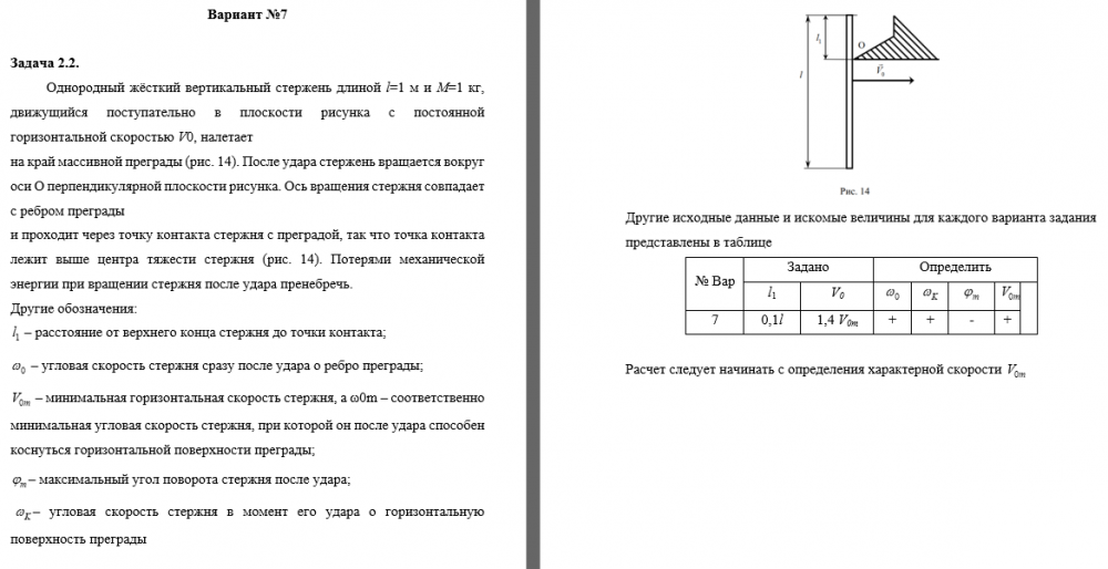14). После удара стержень вращается вокруг оси O перпендикулярной плоскости рисунка. Ось вращения стержня совпадает с ребром преграды и проходит через   точку контакта стержня с преградой, так что точка контакта лежит выше центра тяжести стержня (рис. 14). Потерями механической энергии при вращении стержня после удара пренебречь. Другие обозначения:   – расстояние от верхнего конца стержня до точки контакта;   – угловая скорость стержня сразу после удара о ребро преграды;   – минимальная горизонтальная скорость стержня, а ω0m – соответственно минимальная угловая скорость стержня, при которой он после удара способен коснуться горизонтальной поверхности преграды;  – максимальный угол поворота стержня после удара;    – угловая скорость стержня в момент его удара о горизонтальную поверхность преграды Расчет следует начинать с определения характерной скорости      .