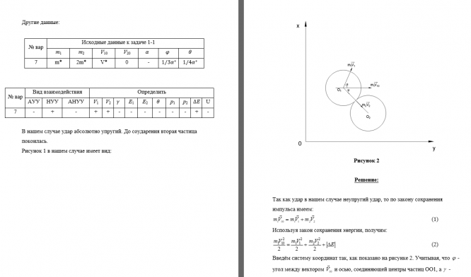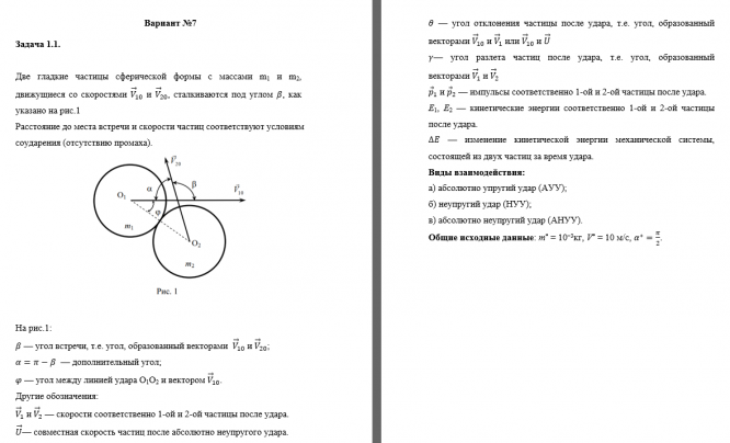 Задача 1.1. Две гладкие частицы сферической формы с массами m1 и m2, движущиеся со скоростями и , сталкиваются под углом , как указано на рис.1 Расстояние до места встречи и скорости частиц соответствуют условиям соударения (отсутствию промаха). На рис.1: — угол встречи, т.е. угол, образованный векторами и ; — дополнительный угол; — угол между линией удара O1O2 и вектором . Другие обозначения: и — скорости соответственно 1-ой и 2-ой частицы после удара. — совместная скорость частиц после абсолютно неупругого удара. — угол отклонения частицы после удара, т.е. угол, образованный векторами и или и — угол разлета частиц после удара, т.е.
