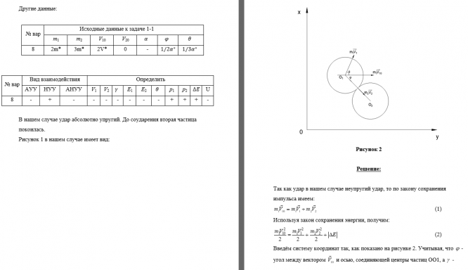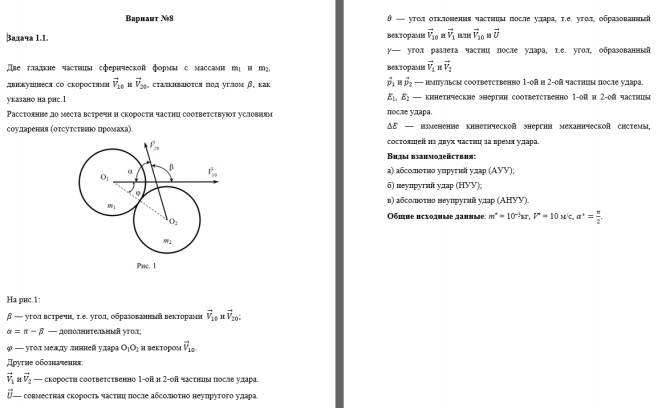 Задача 1.1. Две гладкие частицы сферической формы с массами m1 и m2, движущиеся со скоростями и , сталкиваются под углом , как указано на рис.1 Расстояние до места встречи и скорости частиц соответствуют условиям соударения (отсутствию промаха). На рис.1: — угол встречи, т.е. угол, образованный векторами и ; — дополнительный угол; — угол между линией удара O1O2 и вектором . Другие обозначения: и — скорости соответственно 1-ой и 2-ой частицы после удара. — совместная скорость частиц после абсолютно неупругого удара. — угол отклонения частицы после удара, т.е. угол, образованный векторами и или и — угол разлета частиц после удара, т.е.