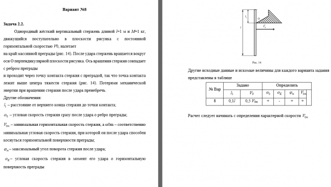 14). После удара стержень вращается вокруг оси O перпендикулярной плоскости рисунка. Ось вращения стержня совпадает с ребром преграды и проходит через точку контакта стержня с преградой, так что точка контакта лежит выше центра тяжести стержня (рис. 14). Потерями механической энергии при вращении стержня после удара пренебречь. Другие обозначения: – расстояние от верхнего конца стержня до точки контакта; – угловая скорость стержня сразу после удара о ребро преграды; – минимальная горизонтальная скорость стержня, а ω0m – соответственно минимальная угловая скорость стержня, при которой он после удара способен коснуться горизонтальной поверхности преграды; – максимальный угол поворота стержня после удара; – угловая скорость стержня в момент его удара о горизонтальную поверхность преграды Расчет следует начинать с определения характерной скорости .