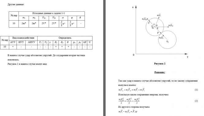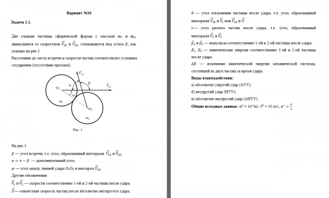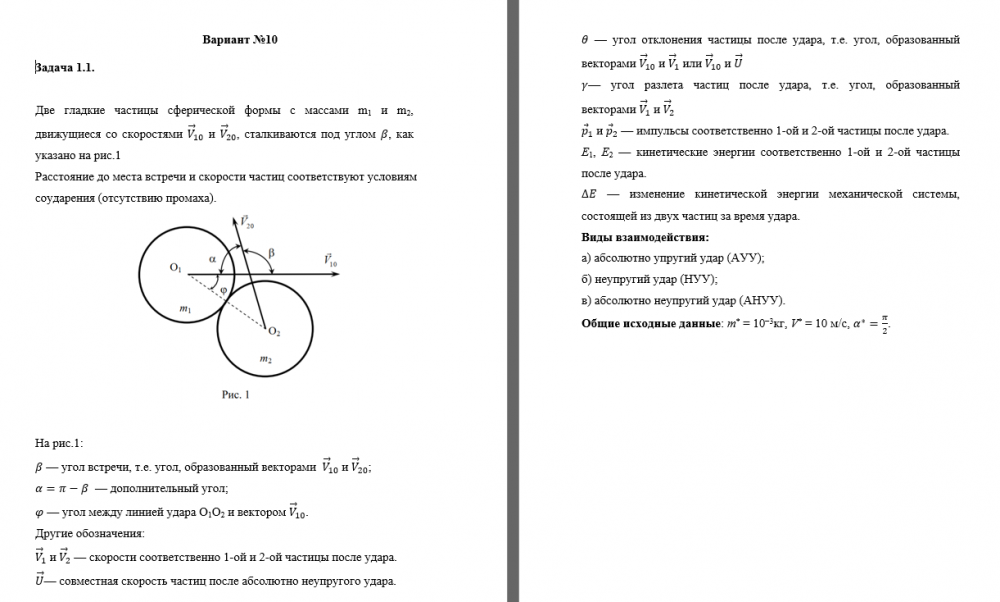 Задача 1.1. Две гладкие частицы сферической формы с массами m1 и m2, движущиеся со скоростями и , сталкиваются под углом , как указано на рис.1 Расстояние до места встречи и скорости частиц соответствуют условиям соударения (отсутствию промаха). На рис.1: — угол встречи, т.е. угол, образованный векторами и ; — дополнительный угол; — угол между линией удара O1O2 и вектором . Другие обозначения: и — скорости соответственно 1-ой и 2-ой частицы после удара. — совместная скорость частиц после абсолютно неупругого удара. — угол отклонения частицы после удара, т.е. угол, образованный векторами и или и — угол разлета частиц после удара, т.е.