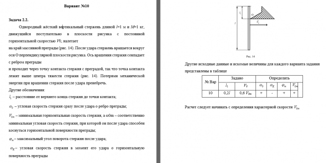 14). После удара стержень вращается вокруг оси O перпендикулярной плоскости рисунка. Ось вращения стержня совпадает с ребром преграды и проходит через точку контакта стержня с преградой, так что точка контакта лежит выше центра тяжести стержня (рис. 14). Потерями механической энергии при вращении стержня после удара пренебречь. Другие обозначения: – расстояние от верхнего конца стержня до точки контакта; – угловая скорость стержня сразу после удара о ребро преграды; – минимальная горизонтальная скорость стержня, а ω0m – соответственно минимальная угловая скорость стержня, при которой он после удара способен коснуться горизонтальной поверхности преграды; – максимальный угол поворота стержня после удара; – угловая скорость стержня в момент его удара о горизонтальную поверхность преграды Расчет следует начинать с определения характерной скорости .