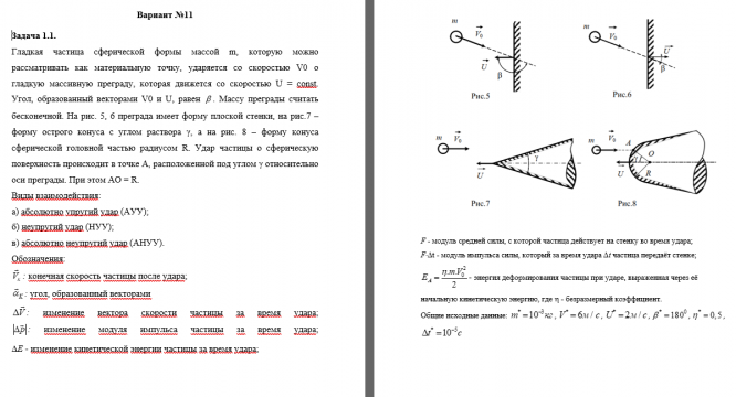 Показать/скрыть дополнительное описаниеЗадача 1.1. Гладкая частица сферической формы массой m, которую можно рассматривать как материальную точку, ударяется со скоростью V0 о гладкую массивную преграду, которая движется со скоростью U = const. Угол, образованный векторами V0 и U, равен . Массу преграды считать бесконечной. На рис. 5, 6 преграда имеет форму плоской стенки, на рис.7 – форму острого конуса с углом раствора γ, а на рис. 8 – форму конуса сферической головной частью радиусом R. Удар частицы о сферическую поверхность происходит в точке А, расположенной под углом γ относительно оси преграды. При этом АО = R. Виды взаимодействия: а) абсолютно упругий удар (АУУ); б) неупругий удар (НУУ); в) абсолютно неупругий удар (АНУУ).