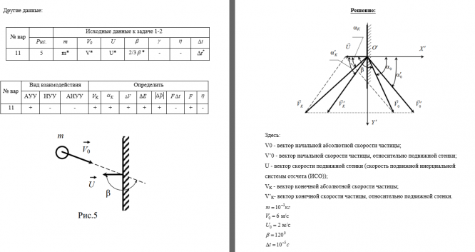 Обозначения: : конечная скорость частицы после удара; : угол, образованный векторами : изменение вектора скорости частицы за время удара; : изменение модуля импульса частицы за время удара; DE - изменение кинетической энергии частицы за время удара F - модуль средней силы, с которой частица действует на стенку во время удара; F ×D t - модуль импульса силы, который за время удара D t частица передаёт стенке; - энергия деформирования частицы при ударе, выраженная через её начальную кинетическую энергию, где h - безразмерный коэффициент. Общие исходные данные: Задача 2.