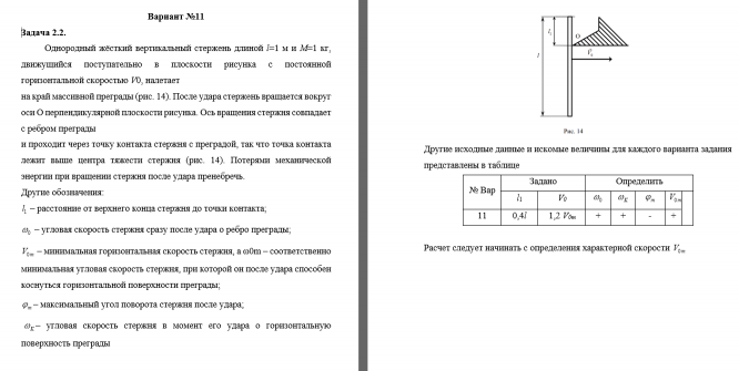 2 . Однородный жёсткий вертикальный стержень длиной l =1 м и М =1 кг, движущийся поступательно в плоскости рисунка с постоянной горизонтальной скоростью V 0, налетает на край массивной преграды (рис. 14). После удара стержень вращается вокруг оси O перпендикулярной плоскости рисунка. Ось вращения стержня совпадает с ребром преграды и проходит через точку контакта стержня с преградой, так что точка контакта лежит выше центра тяжести стержня (рис. 14). Потерями механической энергии при вращении стержня после удара пренебречь. Другие обозначения: – расстояние от верхнего конца стержня до точки контакта; – угловая скорость стержня сразу после удара о ребро преграды; – минимальная горизонтальная скорость стержня, а ω0m – соответственно минимальная угловая скорость стержня, при которой он после удара способен коснуться горизонтальной поверхности преграды; – максимальный угол поворота стержня после удара; – угловая скорость стержня в момент его удара о горизонтальную поверхность преграды Расчет следует начинать с определения характерной скорости .