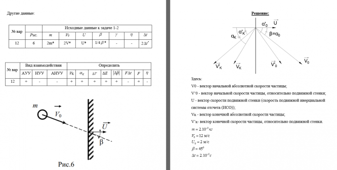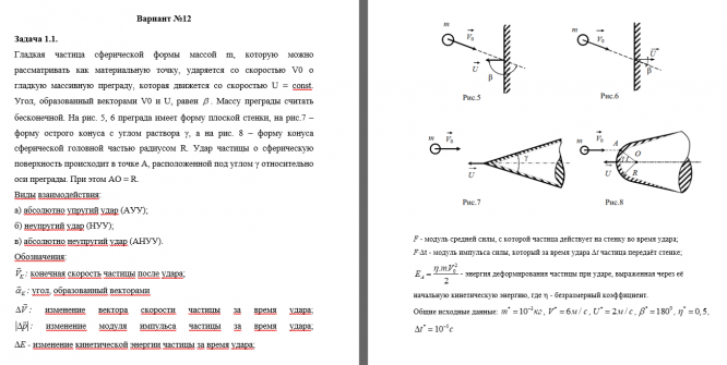 Обозначения:  конечная скорость частицы после удара;  угол, образованный векторами  изменение вектора скорости частицы за время удара;   изменение модуля импульса частицы за время удара;   D- изменение кинетической энергии частицы за время удара   F  - модуль средней силы, с которой частица действует на стенку во время удара;   F ×D t - модуль импульса силы, который за время удара  D t  частица передаёт стенке;    энергия деформирования частицы при ударе, выраженная через её начальную кинетическую энергию, где  h   - безразмерный коэффициент.   Общие исходные данные: Задача 2.