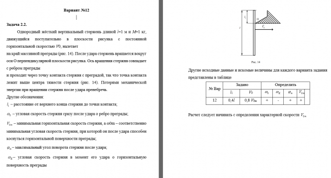 2 . Однородный жёсткий вертикальный стержень длиной  l =1 м и  М =1 кг, движущийся поступательно в плоскости рисунка с постоянной горизонтальной скоростью  V 0, налетает на край   массивной преграды (рис. 14). После удара стержень вращается вокруг оси O перпендикулярной плоскости рисунка. Ось вращения стержня совпадает с ребром преграды и проходит через   точку контакта стержня с преградой, так что точка контакта лежит выше центра тяжести стержня (рис. 14). Потерями механической энергии при вращении стержня после удара пренебречь. Другие обозначения:   – расстояние от верхнего конца стержня до точки контакта;   – угловая скорость стержня сразу после удара о ребро преграды;   – минимальная горизонтальная скорость стержня, а ω0m – соответственно минимальная угловая скорость стержня, при которой он после удара способен коснуться горизонтальной поверхности преграды;  – максимальный угол поворота стержня после удара;    – угловая скорость стержня в момент его удара о горизонтальную поверхность преграды Расчет следует начинать с определения характерной скорости      .