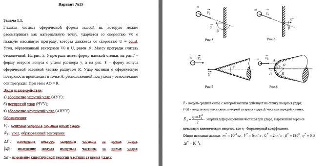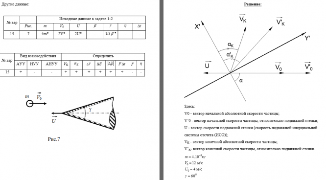 Обозначения:  конечная скорость частицы после удара;  угол, образованный векторами  изменение вектора скорости частицы за время удара;   изменение модуля импульса частицы за время удара;   D- изменение кинетической энергии частицы за время удара   F  - модуль средней силы, с которой частица действует на стенку во время удара;   F ×D t - модуль импульса силы, который за время удара  D t  частица передаёт стенке;    энергия деформирования частицы при ударе, выраженная через её начальную кинетическую энергию, где  h   - безразмерный коэффициент.   Общие исходные данные: Задача 2.