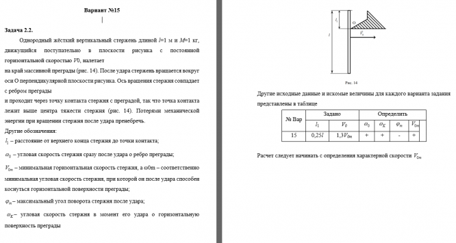 2 . Однородный жёсткий вертикальный стержень длиной  l =1 м и  М =1 кг, движущийся поступательно в плоскости рисунка с постоянной горизонтальной скоростью  V 0, налетает на край   массивной преграды (рис. 14). После удара стержень вращается вокруг оси O перпендикулярной плоскости рисунка. Ось вращения стержня совпадает с ребром преграды и проходит через   точку контакта стержня с преградой, так что точка контакта лежит выше центра тяжести стержня (рис. 14). Потерями механической энергии при вращении стержня после удара пренебречь. Другие обозначения:   – расстояние от верхнего конца стержня до точки контакта;   – угловая скорость стержня сразу после удара о ребро преграды;   – минимальная горизонтальная скорость стержня, а ω0m – соответственно минимальная угловая скорость стержня, при которой он после удара способен коснуться горизонтальной поверхности преграды;  – максимальный угол поворота стержня после удара;    – угловая скорость стержня в момент его удара о горизонтальную поверхность преграды Расчет следует начинать с определения характерной скорости      .