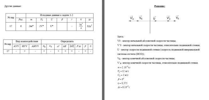 Обозначения: : конечная скорость частицы после удара; : угол, образованный векторами : изменение вектора скорости частицы за время удара; : изменение модуля импульса частицы за время удара; DE - изменение кинетической энергии частицы за время удара F - модуль средней силы, с которой частица действует на стенку во время удара; F ×D t - модуль импульса силы, который за время удара D t частица передаёт стенке; - энергия деформирования частицы при ударе, выраженная через её начальную кинетическую энергию, где h - безразмерный коэффициент. Общие исходные данные: Гладкая частица сферической формы массой m, которую можно рассматривать как материальную точку, ударяется со скоростью V0 о гладкую массивную преграду, которая движется со скоростью U = const.