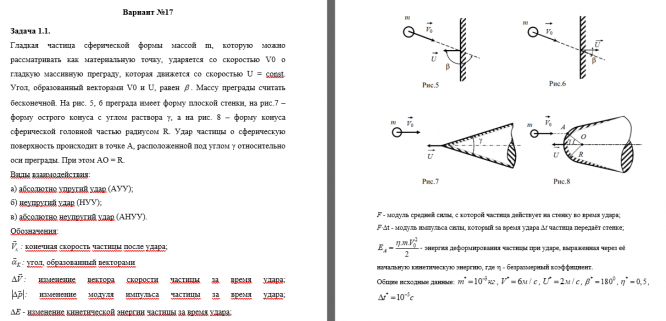 Угол, образованный векторами V0 и U, равен . Массу преграды считать бесконечной. На рис. 5, 6 преграда имеет форму плоской стенки, на рис.7 – форму острого конуса с углом раствора γ, а на рис. 8 – форму конуса сферической головной частью радиусом R. Удар частицы о сферическую поверхность происходит в точке А, расположенной под углом γ относительно оси преграды. При этом АО = R. Виды взаимодействия: а) абсолютно упругий удар (АУУ); б) неупругий удар (НУУ); в) абсолютно неупругий удар (АНУУ). Обозначения: : конечная скорость частицы после удара; : угол, образованный векторами : изменение вектора скорости частицы за время удара; : изменение модуля импульса частицы за время удара; DE - изменение кинетической энергии частицы за время удара; F - модуль средней силы, с которой частица действует на стенку во время удара; F ×D t - модуль импульса силы, который за время удара D t частица передаёт стенке; - энергия деформирования частицы при ударе, выраженная через её начальную кинетическую энергию, где h - безразмерный коэффициент..