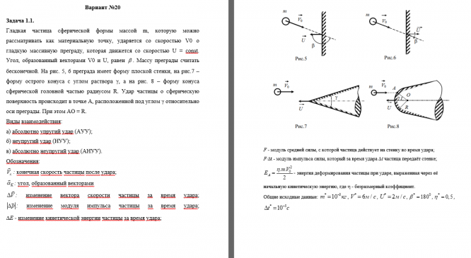 Задача 1.1. Гладкая частица сферической формы массой m, которую можно   рассматривать как материальную точку, ударяется со скоростью V0   о гладкую массивную преграду, которая движется   со скоростью U  =  const. Угол, образованный векторами V0   и U, равен  . Массу преграды считать бесконечной. На рис. 5, 6 преграда имеет форму плоской стенки, на рис.7 – форму острого   конуса с углом раствора γ, а на рис. 8 – форму конуса сферической головной частью радиусом   R. Удар частицы о сферическую поверхность происходит в точке А, расположенной под углом   γ относительно   оси преграды. При этом АО = R. Виды взаимодействия: а) абсолютно упругий удар (АУУ); б) неупругий удар (НУУ); в) абсолютно неупругий удар (АНУУ).