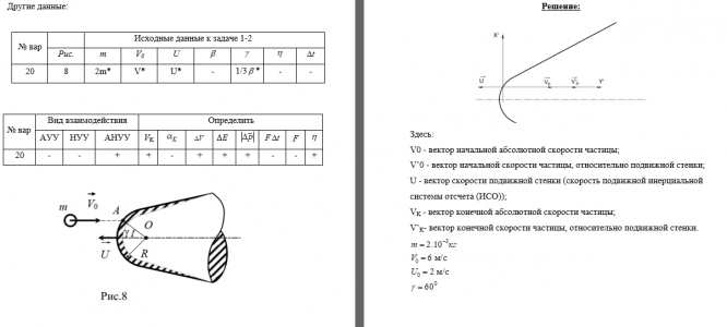 Обозначения:  конечная скорость частицы после удара;  угол, образованный векторами  изменение вектора скорости частицы за время удара;   изменение модуля импульса частицы за время удара;   D- изменение кинетической энергии частицы за время удара   F  - модуль средней силы, с которой частица действует на стенку во время удара;   F ×D t - модуль импульса силы, который за время удара  D t  частица передаёт стенке;    энергия деформирования частицы при ударе, выраженная через её начальную кинетическую энергию, где  h   - безразмерный коэффициент.   Общие исходные данные: Гладкая частица сферической формы массой m, которую можно   рассматривать как материальную точку, ударяется со скоростью V0   о гладкую массивную преграду, которая движется   со скоростью U  =  const.