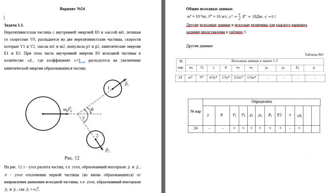 Нерелятивистская частица с внутренней энергией E0 и массой m0, летящая со скоростьюV0,распадается на две нерелятивистские частицы, скорости которых V1иV2, массы m1 и m2,импульсы p1иp2, кинетические энергии E1 и E2. При этом часть внутренней энергии E0 исходной частицы в количестве ,где коэффициент <1, расходуется на увеличение кинетическойэнергии образовавшихся частиц.