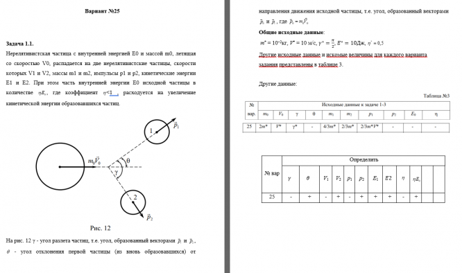 Нерелятивистская частица с внутренней энергией E0 и массой m0, летящая со скоростьюV0,распадается на две нерелятивистские частицы, скорости которых V1иV2, массы m1 и m2,импульсы p1иp2, кинетические энергии E1 и E2. При этом часть внутренней энергии E0 исходной частицы в количестве ,где коэффициент <1, расходуется на увеличение кинетическойэнергии образовавшихся частиц.