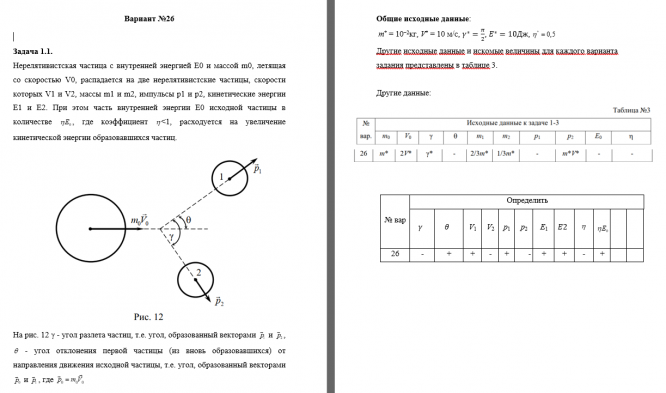 Нерелятивистская частица с внутренней энергией E0 и массой m0, летящая со скоростьюV0,распадается на две нерелятивистские частицы, скорости которых V1иV2, массы m1 и m2,импульсы p1иp2, кинетические энергии E1 и E2. При этом часть внутренней энергии E0 исходной частицы в количестве ,где коэффициент <1, расходуется на увеличение кинетическойэнергии образовавшихся частиц.