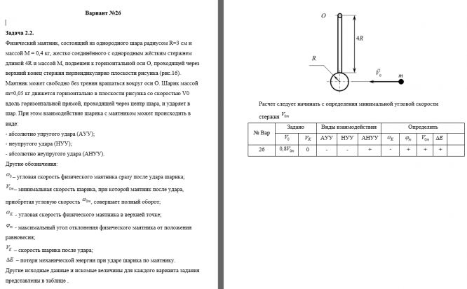 Маятник может свободно без трения вращаться вокруг оси O. Шарик массой m=0,05 кг движется горизонтально в плоскости рисунка со скоростью V0 вдоль горизонтальной прямой, проходящей через центр шара, и ударяет в шар. При этом взаимодействие шарика с маятником может происходить в виде: - абсолютно упругого удара (АУУ); - неупругого удара (НУУ); - абсолютно неупругого удара (АНУУ). Другие обозначения: – угловая скорость физического маятника сразу после удара шарика; – минимальная скорость шарика, при которой маятник после удара, приобретая угловую скорость , совершает полный оборот;  - угловая скорость физического маятника в верхней точке;  - максимальный угол отклонения физического маятника от положения равновесия;  – скорость шарика после удара;  – потери механической энергии при ударе шарика по маятнику.