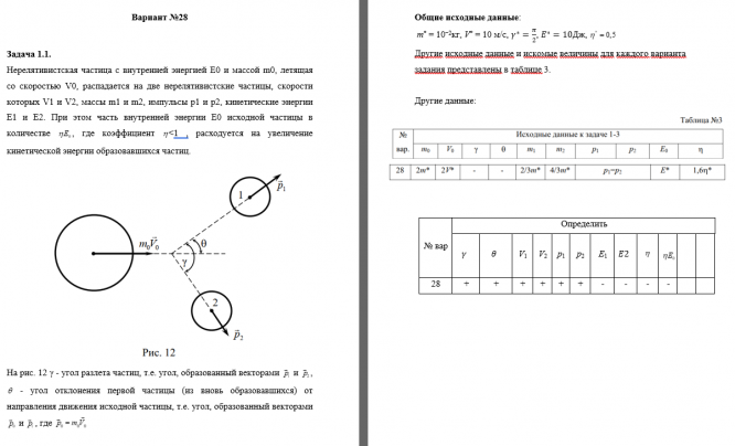 Нерелятивистская частица с внутренней энергией E0 и массой m0, летящая со скоростьюV0,распадается на две нерелятивистские частицы, скорости которых V1иV2, массы m1 и m2,импульсы p1иp2, кинетические энергии E1 и E2. При этом часть внутренней энергии E0 исходной частицы в количестве ,где коэффициент <1, расходуется на увеличение кинетическойэнергии образовавшихся частиц.