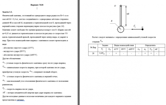 Маятник может свободно без трения вращаться вокруг оси O. Шарик массой m=0,05 кг движется горизонтально в плоскости рисунка со скоростью V0 вдоль горизонтальной прямой, проходящей через центр шара, и ударяет в шар. При этом взаимодействие шарика с маятником может происходить в виде: - абсолютно упругого удара (АУУ); - неупругого удара (НУУ); - абсолютно неупругого удара (АНУУ). Другие обозначения: – угловая скорость физического маятника сразу после удара шарика; – минимальная скорость шарика, при которой маятник после удара, приобретая угловую скорость , совершает полный оборот;  - угловая скорость физического маятника в верхней точке;  - максимальный угол отклонения физического маятника от положения равновесия;  – скорость шарика после удара;  – потери механической энергии при ударе шарика по маятнику.