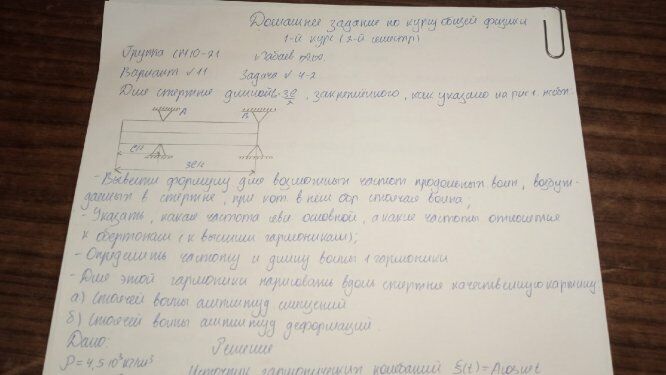 № вар. | Вид крепления | Материал | Плотность ρ, 103 кг/м3 | Модуль Юнга Е, 1010Па | Длина l, м | Определить i-ю гармонику |