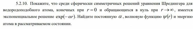 5.2.10. Покажите, что среди сферически симметричных решений уравнения Шредингера для водородоподобного атома, конечных при r  0 и обращающихся в нуль при r  , имеется экспоненциальное решение expαr . Найдите постоянную  , волновую функцию r и энергию атома в рассматриваемом состоянии.