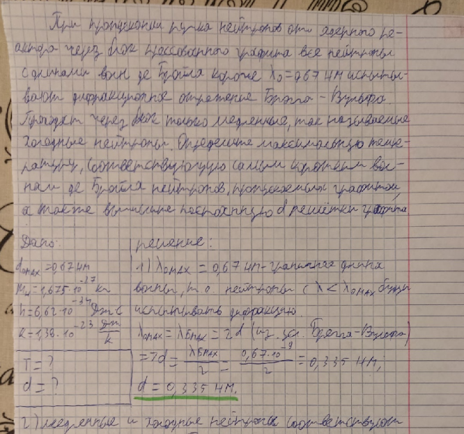 5.1.10. При пропускании пучка нейтронов от ядерного реактора через блок прессованного графита все нейтроны с длинами волн де Бройля короче 0  0,67 нм испытывают дифракционное отражение Брэгга-Вульфа. Проходят через блок только медленные, так называемые холодные нейтроны. Определите максимальную температуру, соответствующую самым коротким волнам де Бройля нейтронов, пропускаемых графитом, а также вычислите постоянную d решетки графита.