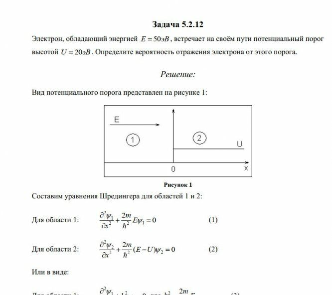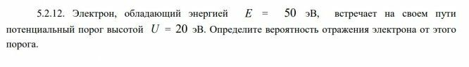 5.2.12. Электрон, обладающий энергией E = 50 эВ, встречает на своем пути потенциальный порог высотой U = 20 эВ. Определите вероятность отражения электрона от этого порога.
